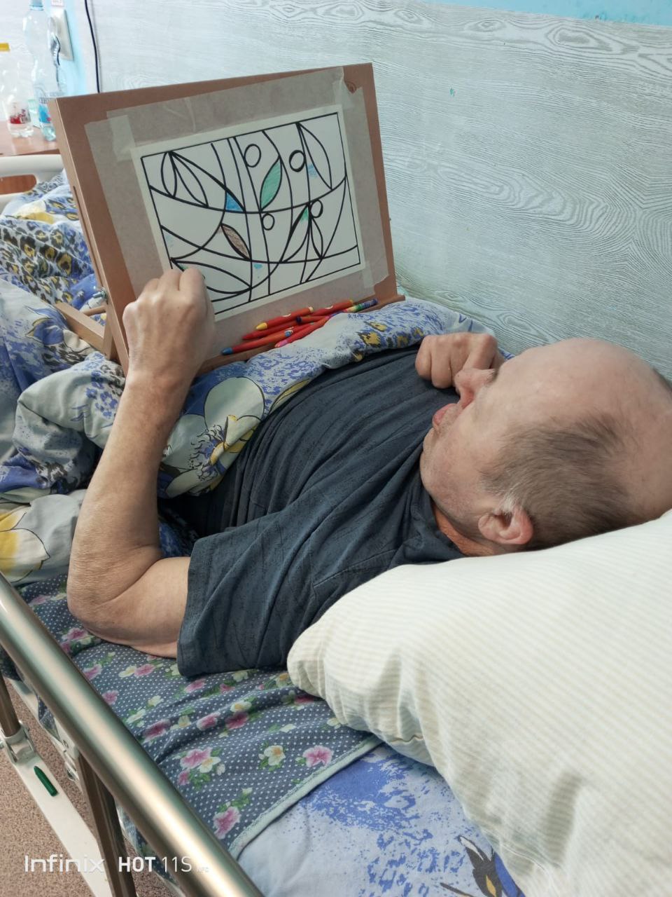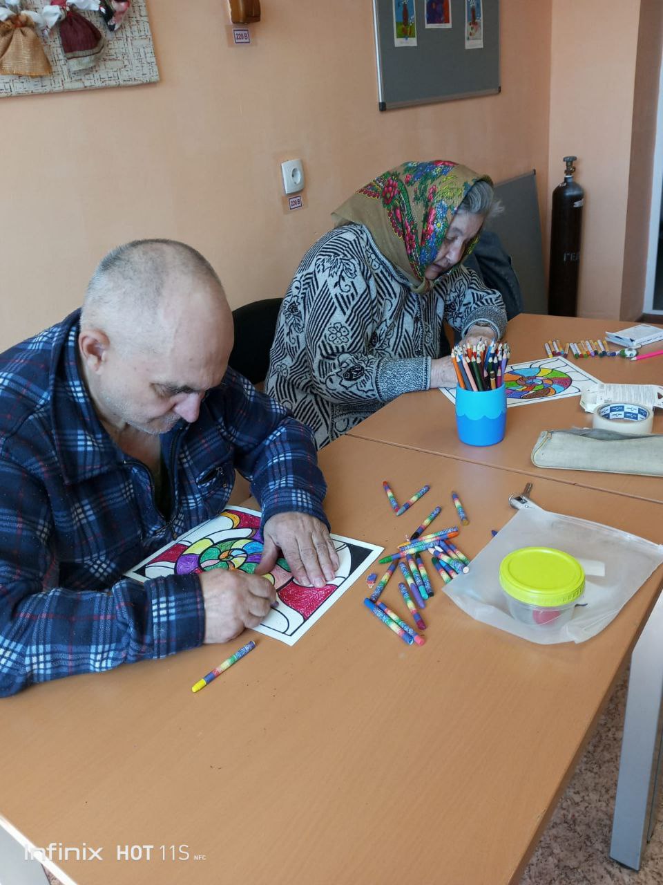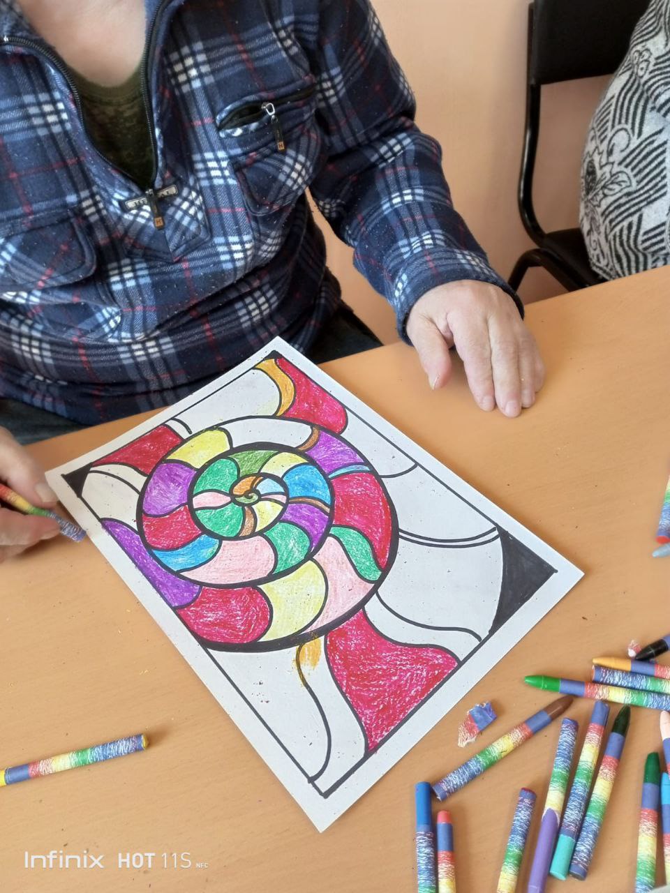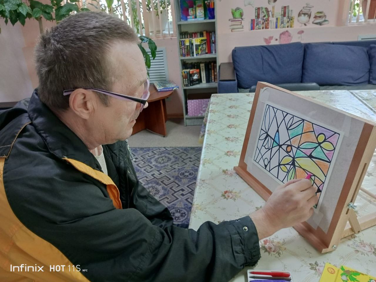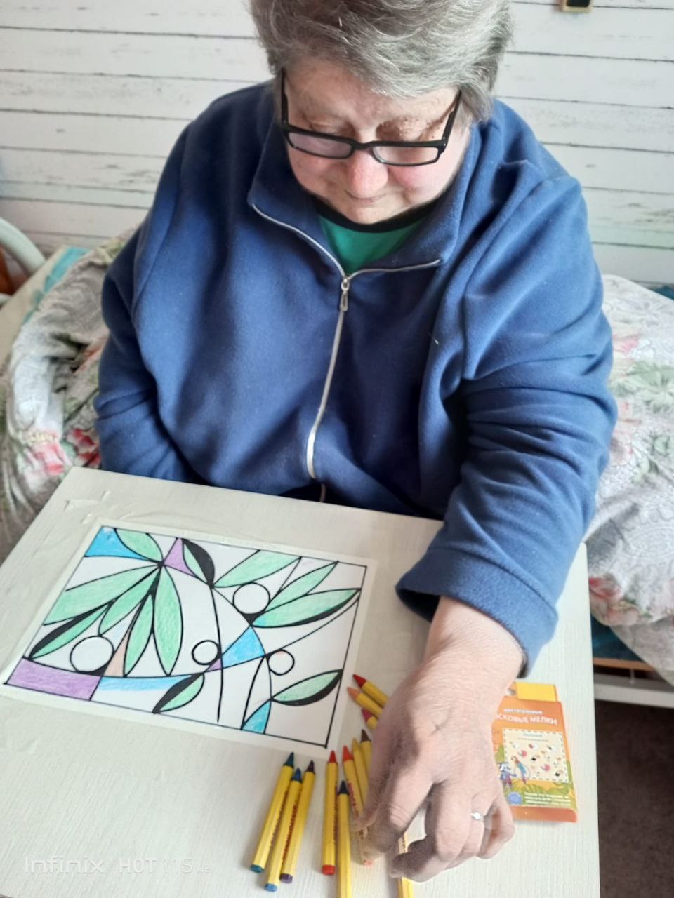Маломобильные и не мобильные проживающие осваивали работу на мольбертах, специально приобретённых для занятий. И познакомились с новой техникой "витражные рисунки на бумаге", работали с новым инструментом - пастель и восковые мелки.