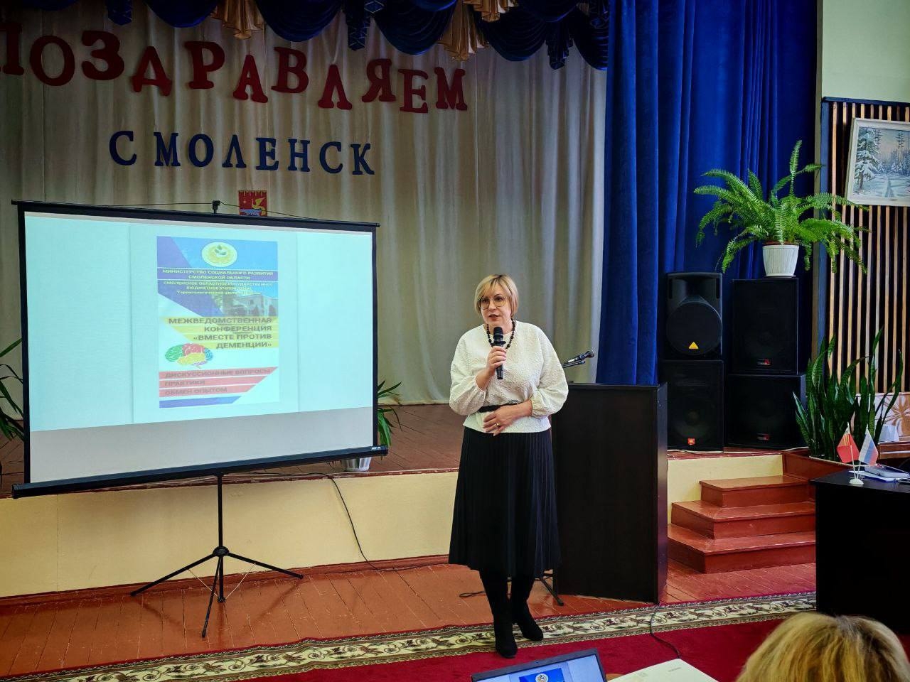 С приветственным словом выступила заместитель председателя Правительства Смоленской области – министр здравоохранения Смоленской области Виктория Николаевна Макарова: «Проблема деменции актуальна в настоящее время из-за роста распространенности заболевания, необходимости ранней диагностики и мер по профилактике. Полностью остановить прогрессирование деменции невозможно — существующие лекарства не останавливают нейродегенерацию, а лишь смягчают симптомы. Однако есть методы, которые могут замедлить ухудшение когнитивных функций, улучшить качество жизни пациента и его близких. Комплексный подход включает медикаментозное лечение, изменение образа жизни, диагностику и уход. Сегодня этому посвящена конференция, которая так и называется «Вместе против деменции»».